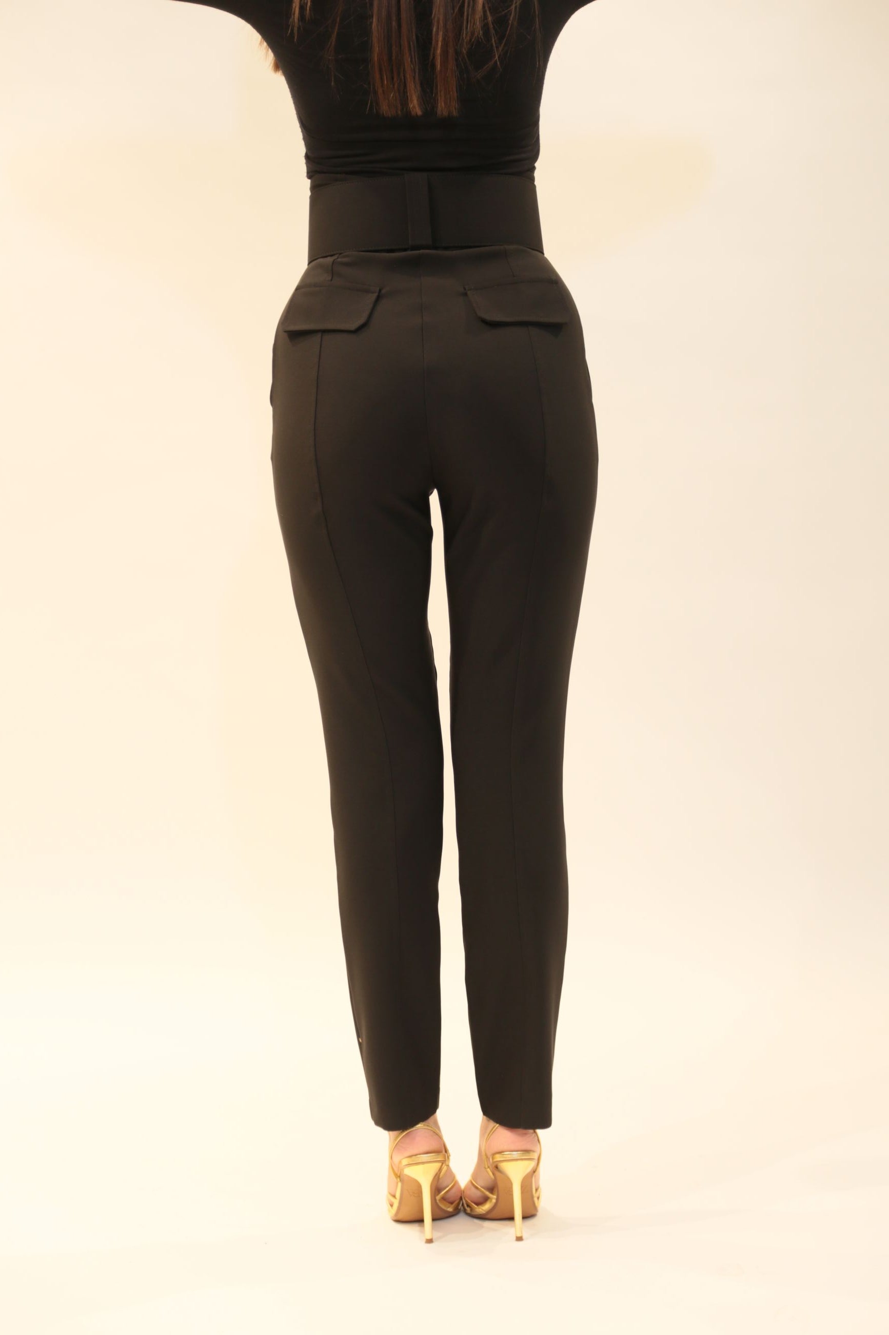 - Vita alta con cinturone: dettaglio che valorizza la silhouette e definisce il punto vita con eleganza