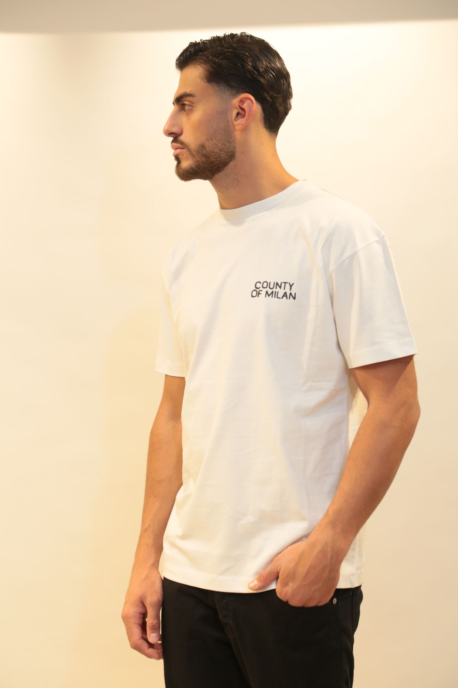 Abbinala a jeans skinny e sneakers per un look street perfetto, oppure sotto una giacca bomber per un outfit layered di tendenza. La versatilità dei colori off white e nero la rende un must-have per ogni guardaroba maschile contemporaneo.